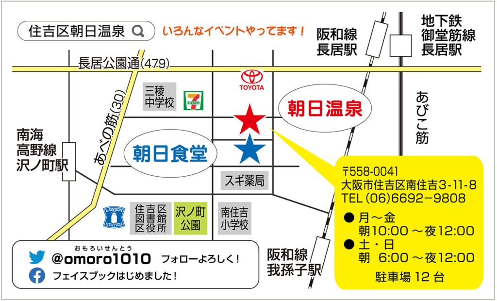 朝日温泉前は一方通行になっておりますので、お車でのご来ご来場の際は南住吉小学校前の道からお越しください。道沿いに「朝日温泉専用駐車場」がございます。